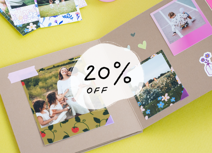 Imprime tus fotos instantáneas de estilo retro en línea desde cualquier dispositivo, personaliza los colores de los marcos y los pies de foto, y elige entre múltiples tamaños y formatos.