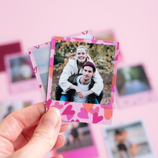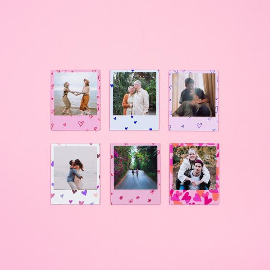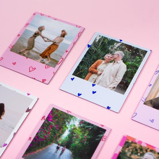 Puedes encontrar fotos magnéticas de diferentes formas: cuadradas (2,75×2,75") o (2×2"), redondas (2,75"), rectángulo (2,75×2″), estilo polaroid (2×2,75″) o corazón (2,75").